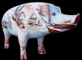 | The Seattle Public Market Foundation rounded up 200 pigs which were painted and paraded down the streets of Seattle. At summer's end the Pigs were auctioned to raise money for the Market Foundation. Evan's Souvenir of Seattle pig brought over $10,000. The pig was sent to Seattle's sister city in Tashkent, Russia. | ||